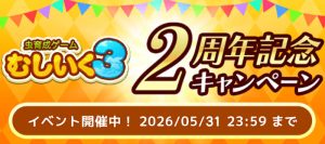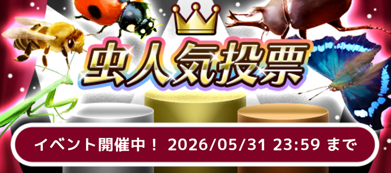 虫ゲームズで「虫人気投票2026」開催中! 2026.04.29 最終更新日時 : 2026.04.29 カメダキョウヘイ 4/28から、昨年も実施した『虫人気投票イベント』を開催中です! 昨年の虫人気投票の結果を見る 人気上位9種の虫は、8月に開催予定の「人気投票ガチャ」でピックアップ虫として登場します! 本イベントに参加できるのは「虫&バトル」「むしマスター!3」「虫&バトル ストライカーズ」の3タイトル! 投票券は・ログイン・日替わりミッションクリア・ガチャのおまけでゲットできます。 ぜひ、推しの虫に投票して応援してみてください! 本イベントに参加できるゲームはこちら▼ 虫&バトル虫が主役のターン制バトルRPG 詳しく見る むしマスター!3虫探し&コレクションゲーム 詳しく見る 虫&バトル ストライカーズ虫が主役の戦略カードバトルRPG 詳しく見る FacebookXBluesky